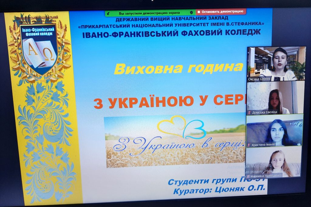 1 вересня 2021 року студенти групи ПО-31 Івано-Франківського фахового коледжу Прикарпатського національного університету імені Василя Стефаника разом із куратором групи Оксаною Цюняк провели виховний онлайн захід на тему «В моєму серці Україна», приурочену 30 річниці проголошення незалежності України. Захід розпочався Читати далі