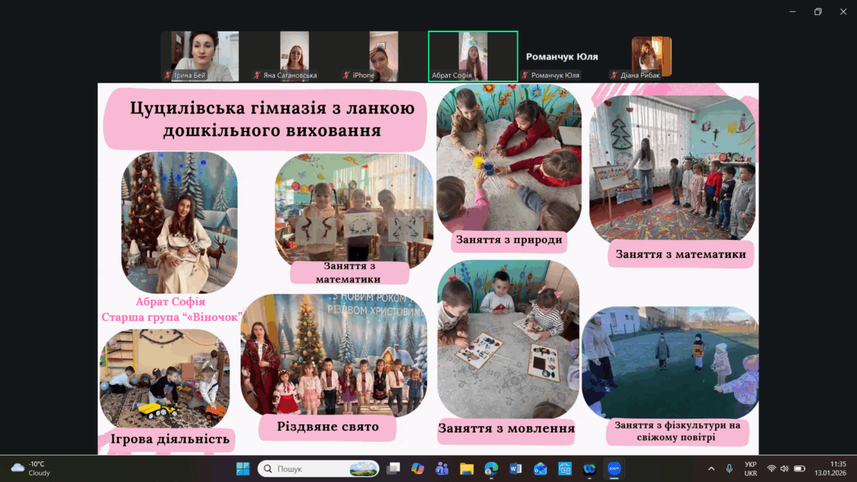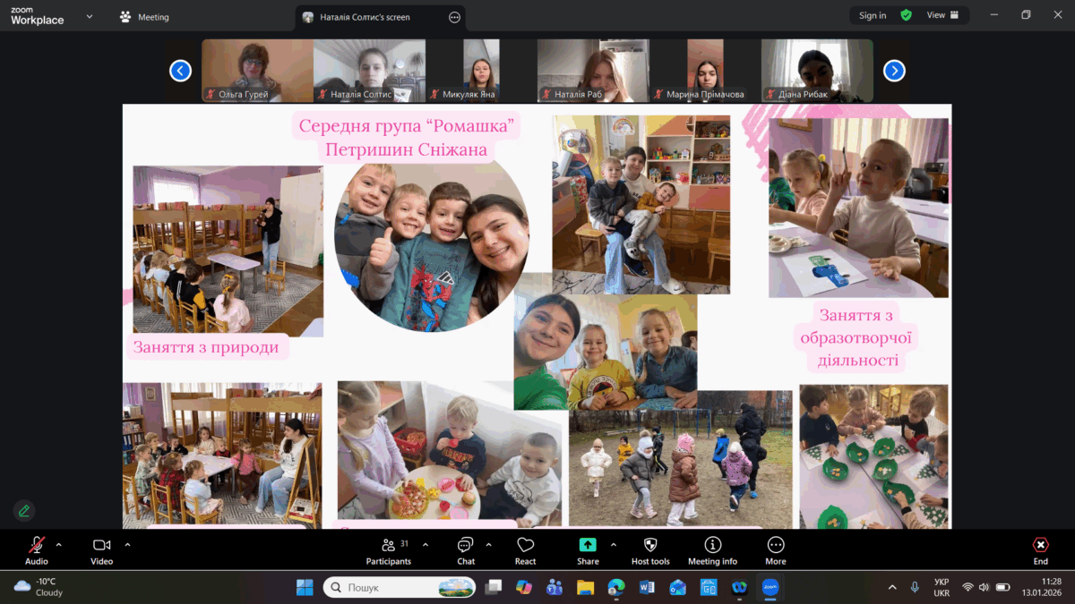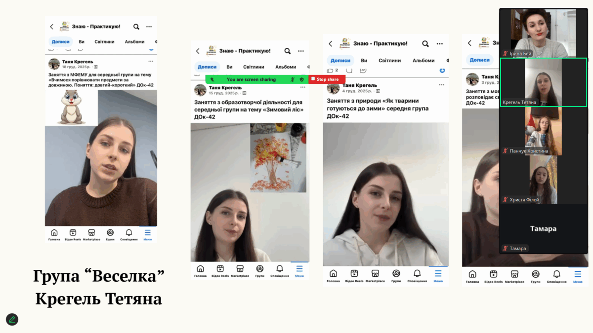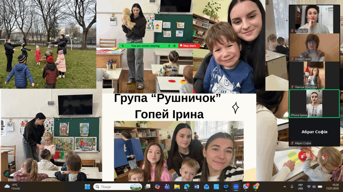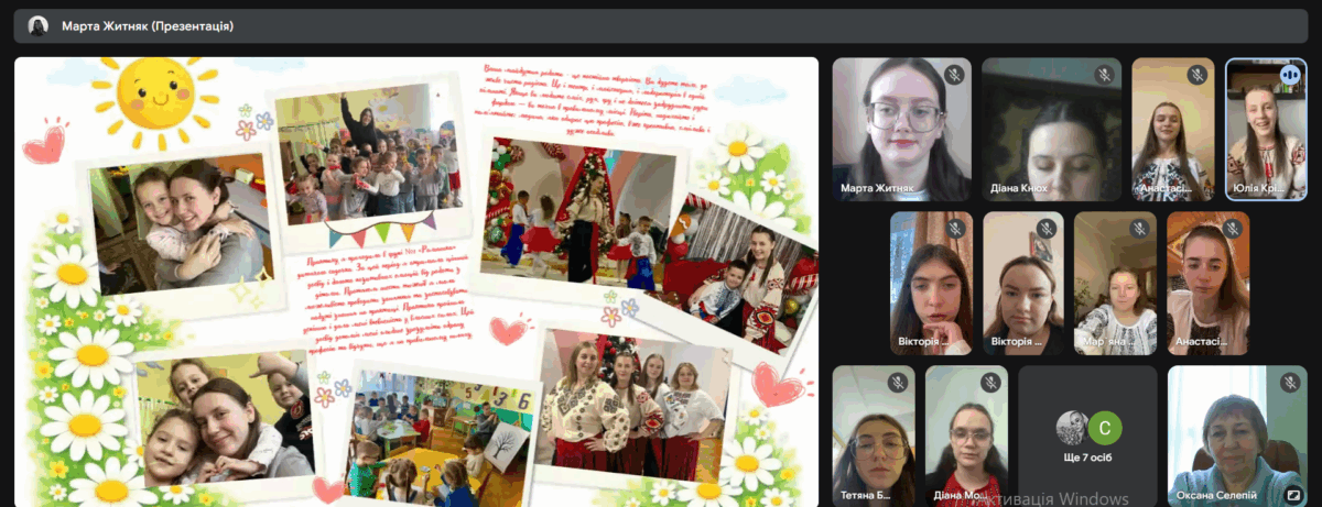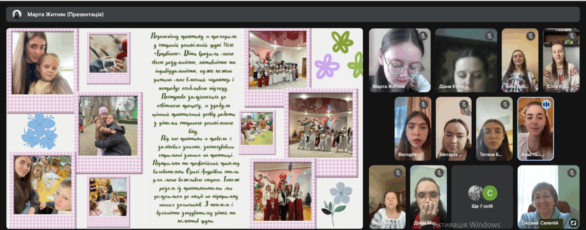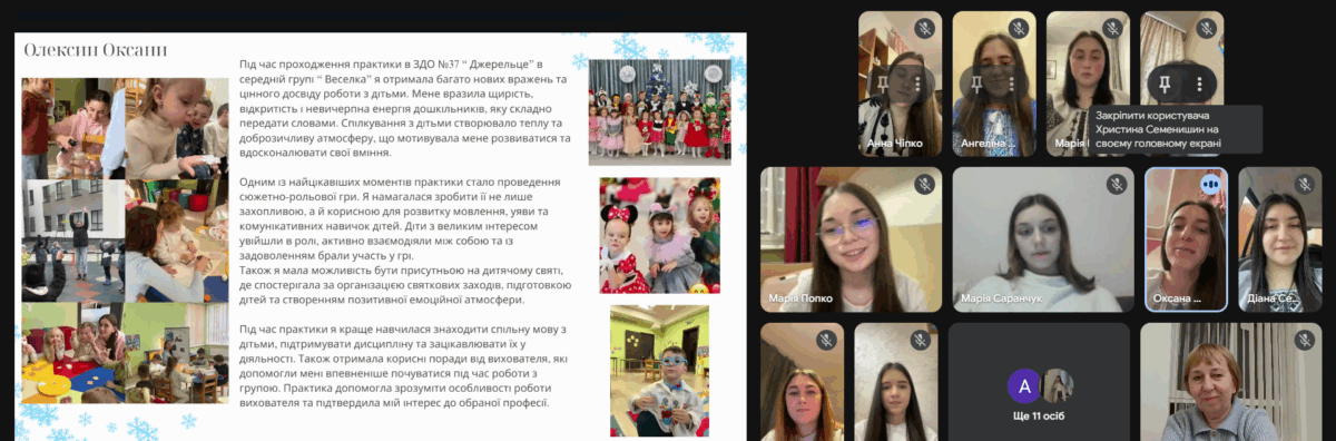 Здобувачки освіти представили результати проходження педагогічної практики, продемонструвавши сформовані професійні вміння й навички, необхідні для організації освітнього процесу в групах дітей середнього та старшого дошкільного віку. У змістовних презентаціях і відеоматеріалах студентки представили світлини залікових занять з фахових методик, а також ретельно підготовлене методичне забезпечення до них.