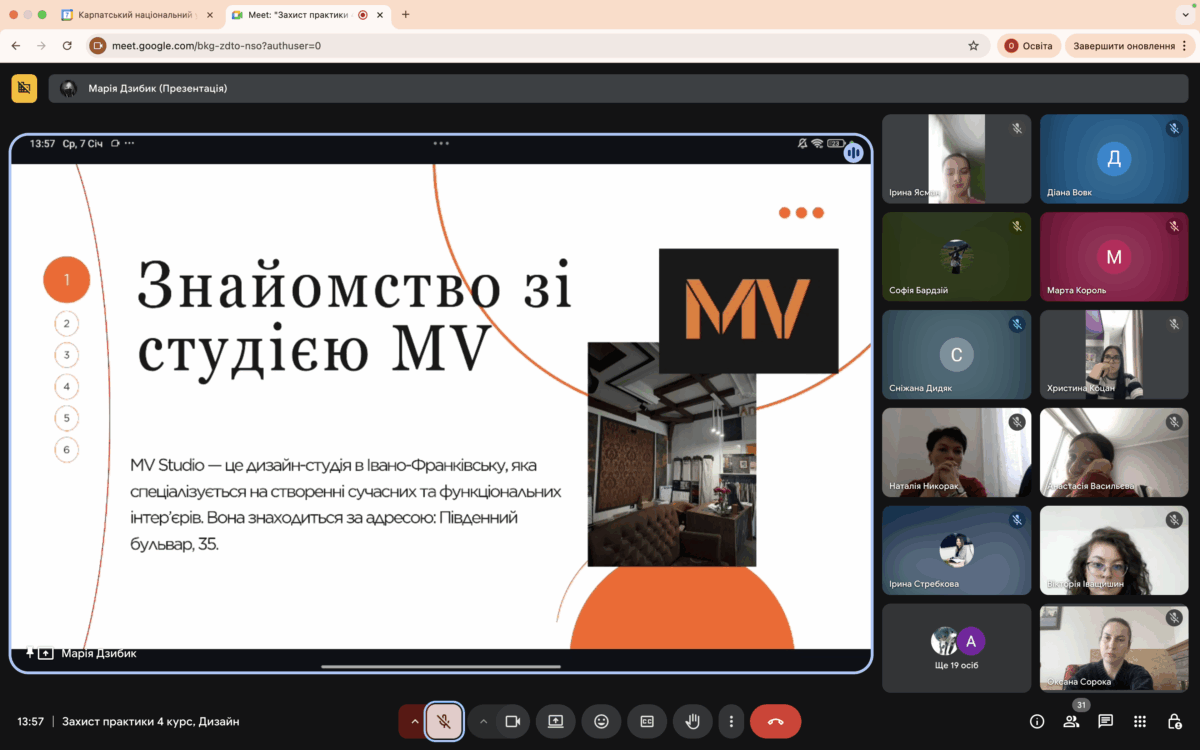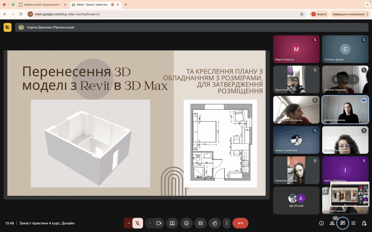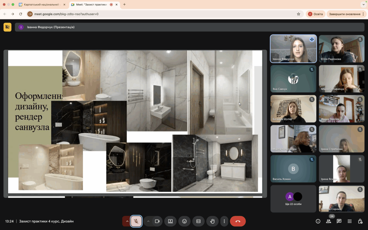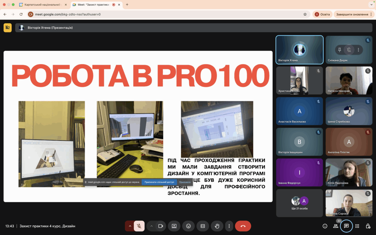 Під час захисту студенти представили результати своєї практичної роботи, виконаної на базі дизайн-студій, дизайн-компаній, фірм, бюро та інших організацій міста Івано-Франківська, діяльність яких пов’язана зі сферою дизайну середовища. Упродовж трьох тижнів здобувачі-практиканти мали можливість творчо працювати в професійних колективах, виконувати обов’язки помічників дизайнерів, декораторів, архітекторів, безпосередньо спостерігати за розробкою ескізів та дизайн-проєктів, знайомилися зі специфікою роботи з клієнтами тощо.