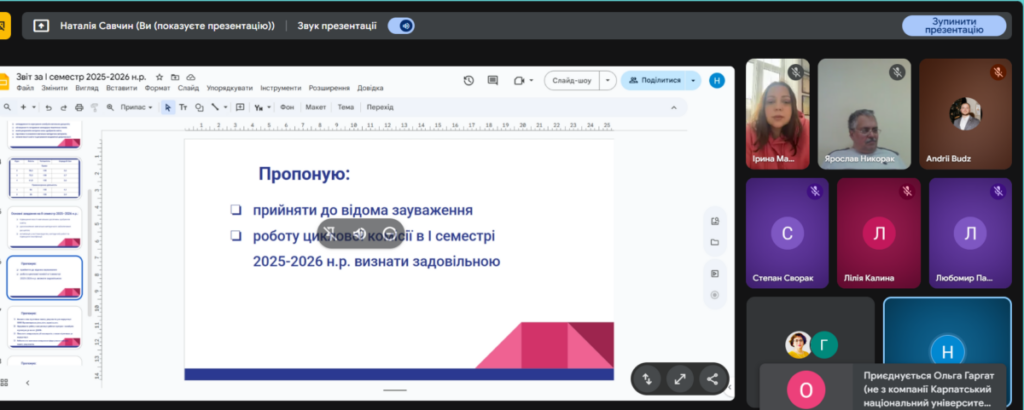 Голови циклових комісій Наталія Савчин та Ірина Малиновська надали інформацію про роботу циклових комісій у І семестрі 2025-2026 н.р., охарактеризували стан підготовки та оновлення пакету документів для проведення акредитації освітньо-професійних програм відповідно до вимог ДСЯО.