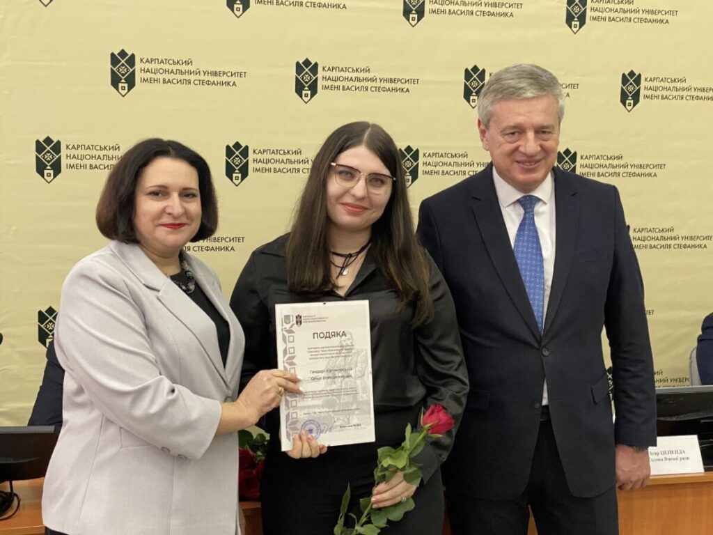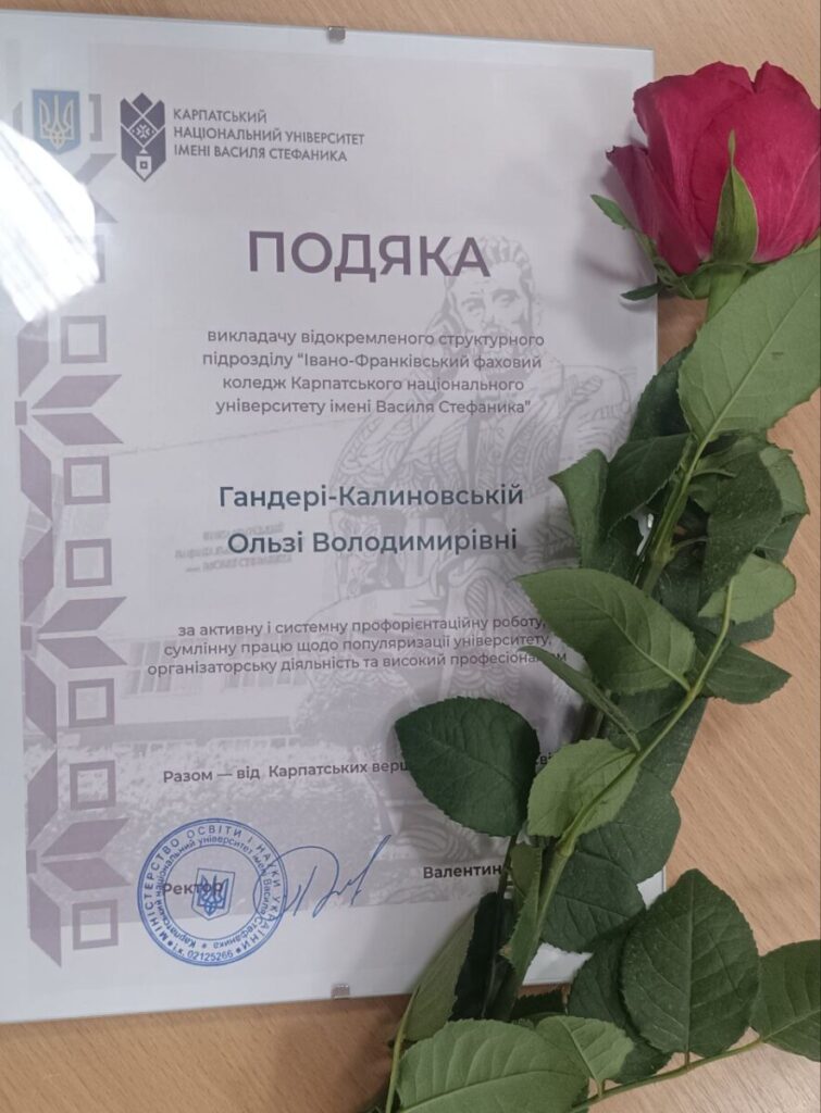 На засіданні Вченої ради Карпатського національного університету, яке відбулося 27 січня, Подякою за активну і системну профорієнтаційну роботу, сумлінну працю щодо популяризації університету, організаторську діяльність та високий професіоналізм, була відзначена викладачка відділення інформаційних технологій – Ольга Володимирівна Гандера-Калиновська.