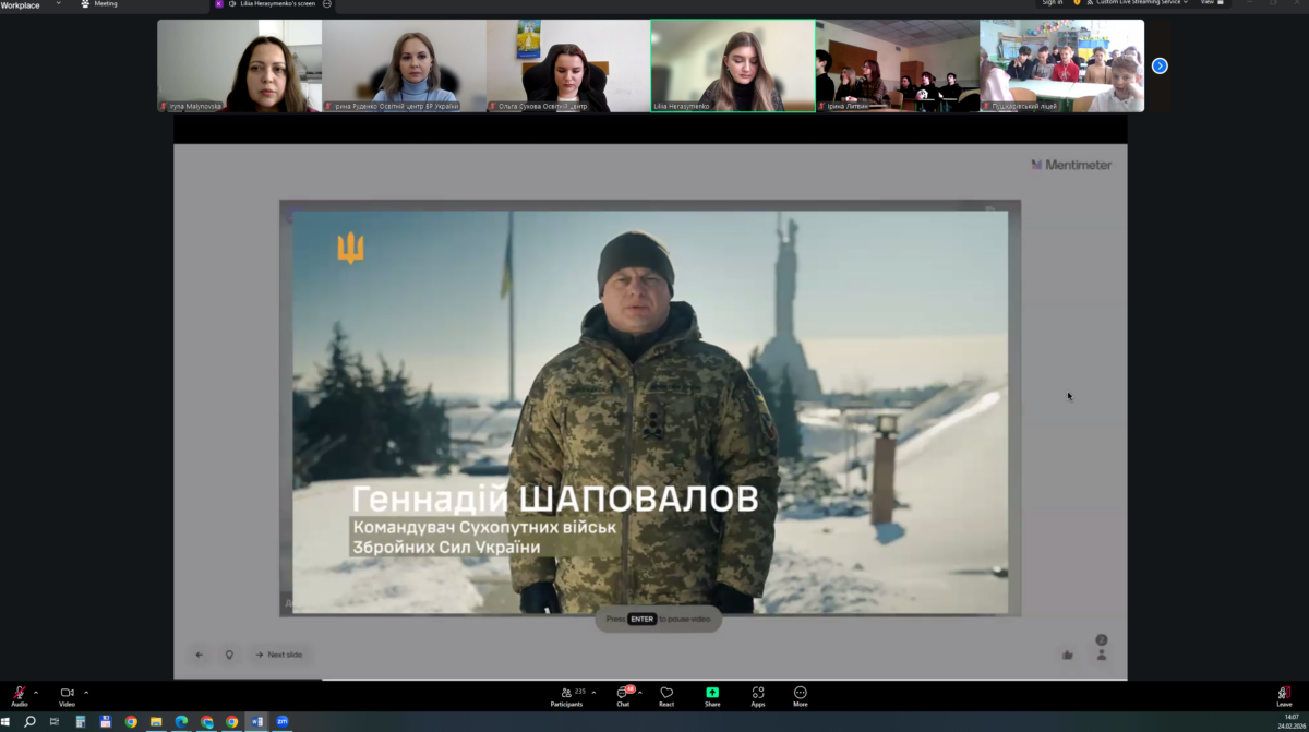 Студенти 1 курсу спеціальності «Секретарська та офісна справа» разом із куратором Малиновською Іриною взяли участь у Всеукраїнському онлайн-заході Освітнього центру Верховної Ради України, присвяченому четвертим роковинам повномасштабного вторгнення рф на територію України.