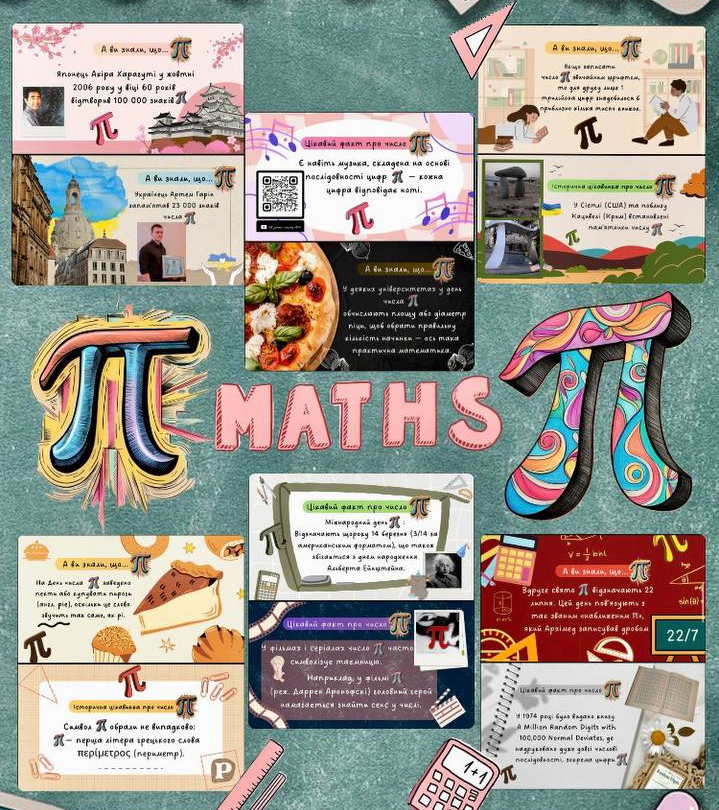 Серед представлених робіт — тематичні відео, добірки цікавих фактів про число π, студентські інтерв’ю, а також різноманітні математичні розробки та пізнавальні матеріали.