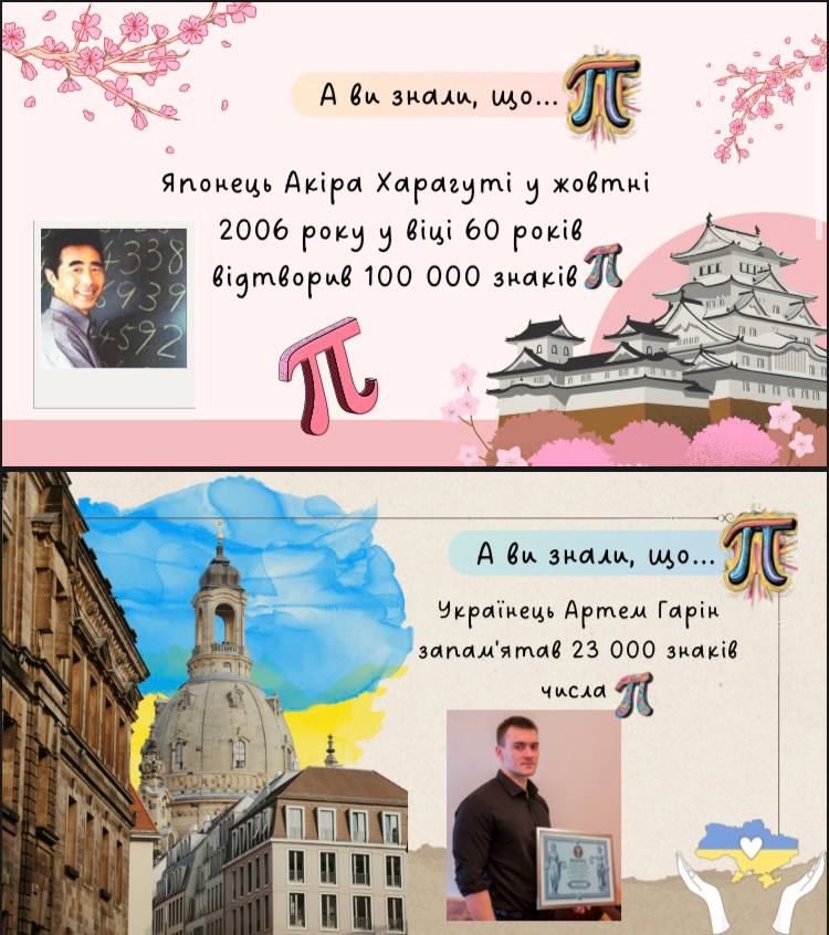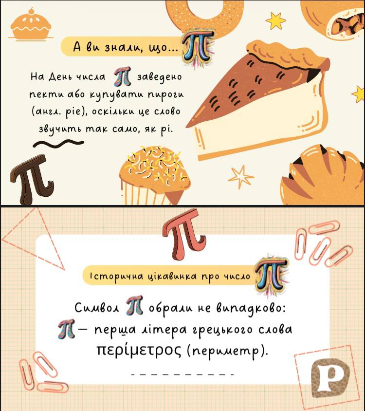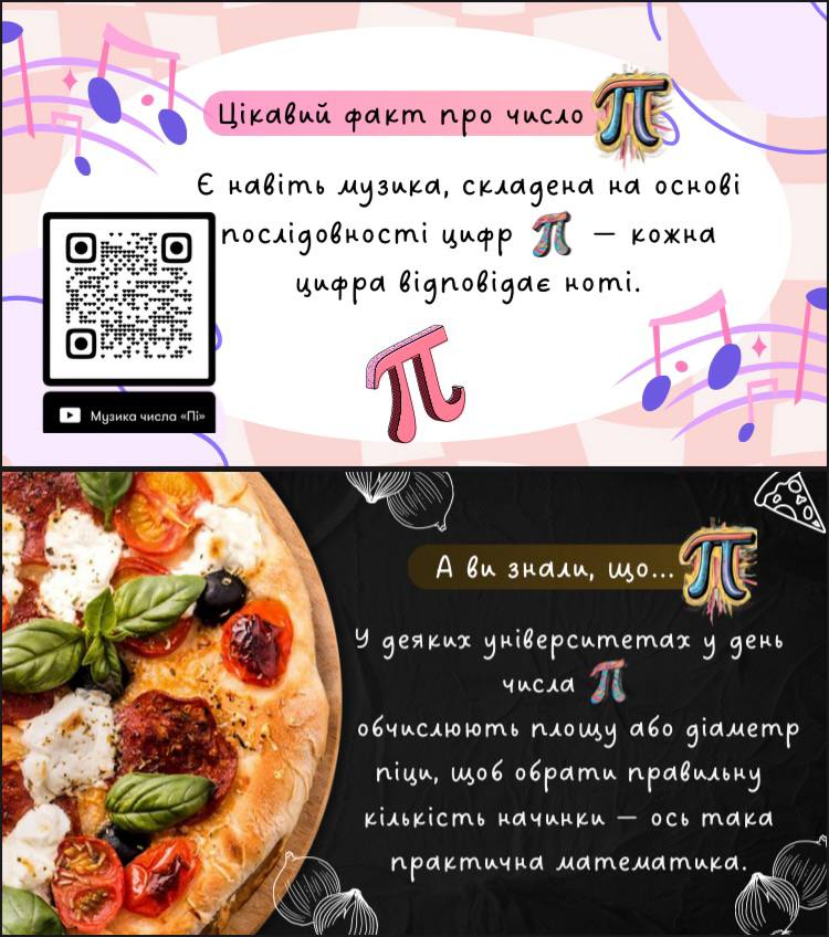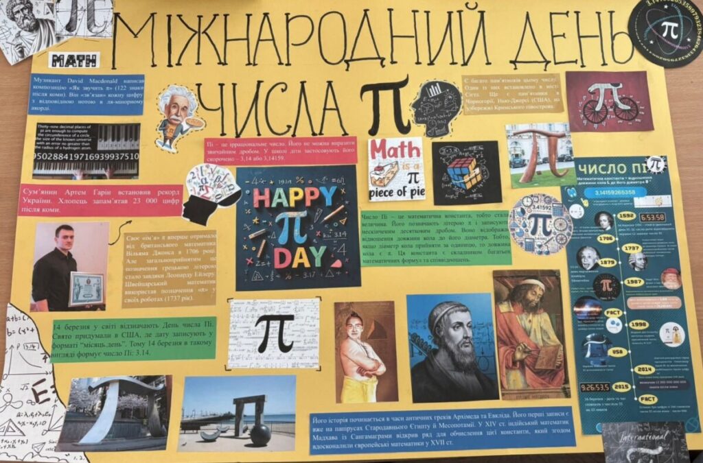 Серед представлених робіт — тематичні відео, добірки цікавих фактів про число π, студентські інтерв’ю, а також різноманітні математичні розробки та пізнавальні матеріали.